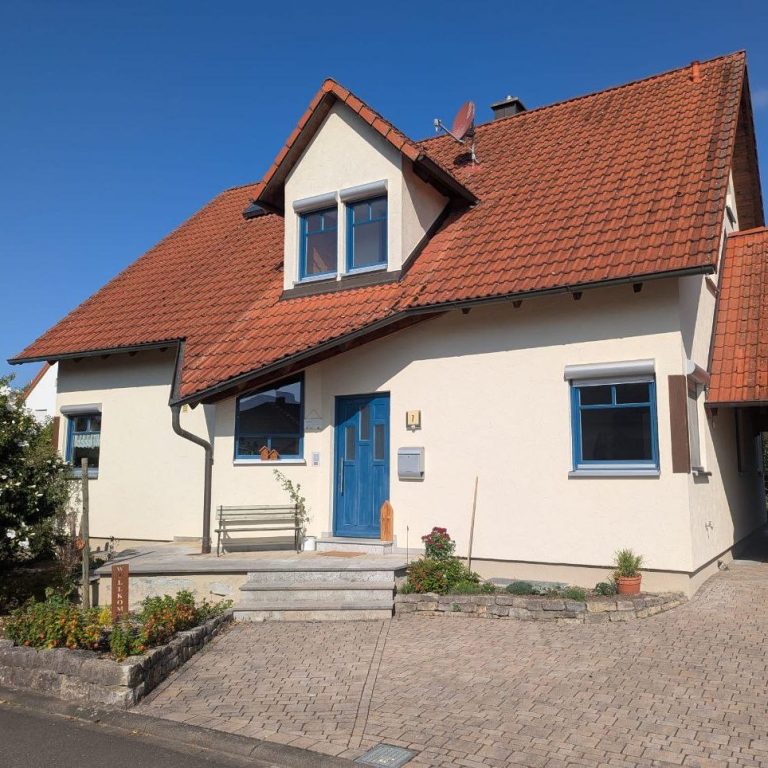 Von Volkach kommend biegen Sie nach dem Ortseingang die erste links ein, folgen dem Straßenverlauf und biegen dann die 4. links ein. Danach die erste rechts und der Straße folgen zum Eckgrundstück Am Brücklein 7.